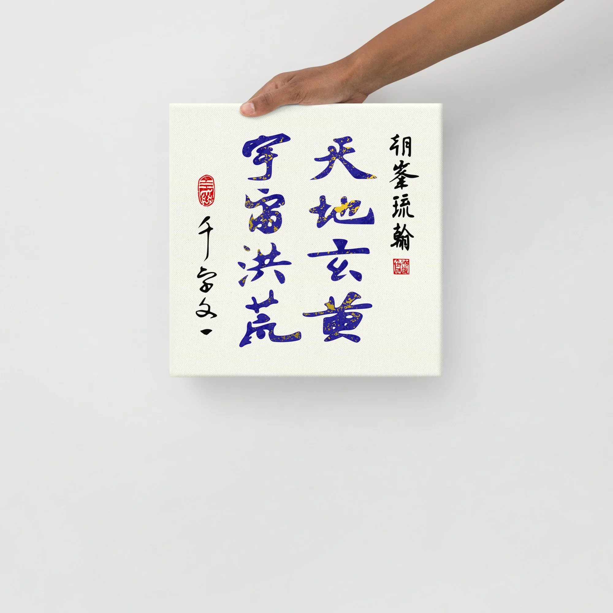 Chinese calligraphy of the first couplet of the Thousand Character Classic, a Chinese poem of ancient origin used to teach Chinese characters familiar to many East Asian cultures: China, Korea, Japan, and Vietnam all have their ways to read this poem transcending borders. The calligraphy itself is modelled after the great masters of the Song Dynasty, with the main text coloured with the sapphire blue hue of lapis lazuli stone speckled with golden pyrite inclusions. Decorate your space with a piece reflecting the philosophy and history of East Asia with this high resolution print!